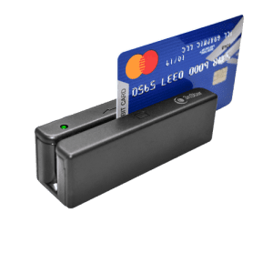 - El lector de tarjetas magnéticas de tres pistas se puede utilizar para deslizar y leer la banda magnética en la parte posterior de una tarjeta de crédito o débito u otra tarjeta de banda magnética