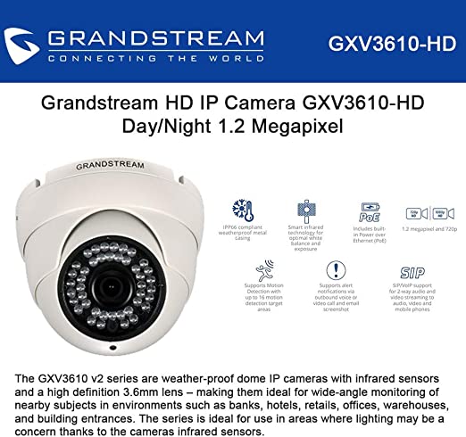 Cuenta con compresión de vídeo H.264 en tiempo real, líder en la industria SIP/VoIP para el audio de 2 vías y streaming de vídeo a teléfonos móviles y de video. PoE integrado, iluminación infraroja IR para el modo día/noche, y protección para instalación en exterior. Toda la serie de cámaras GXV3610 puede ser manejado con GSurf_Pro (software de gestión de vídeo GRATIS de Grandstream que controla hasta 36 cámaras a la vez), así como otros sistemas de gestión de vídeo compatibles ONVIF . También ofrece un avanzado y flexible HTTP API para facilitar la integración con otros sistemas de vigilancia .