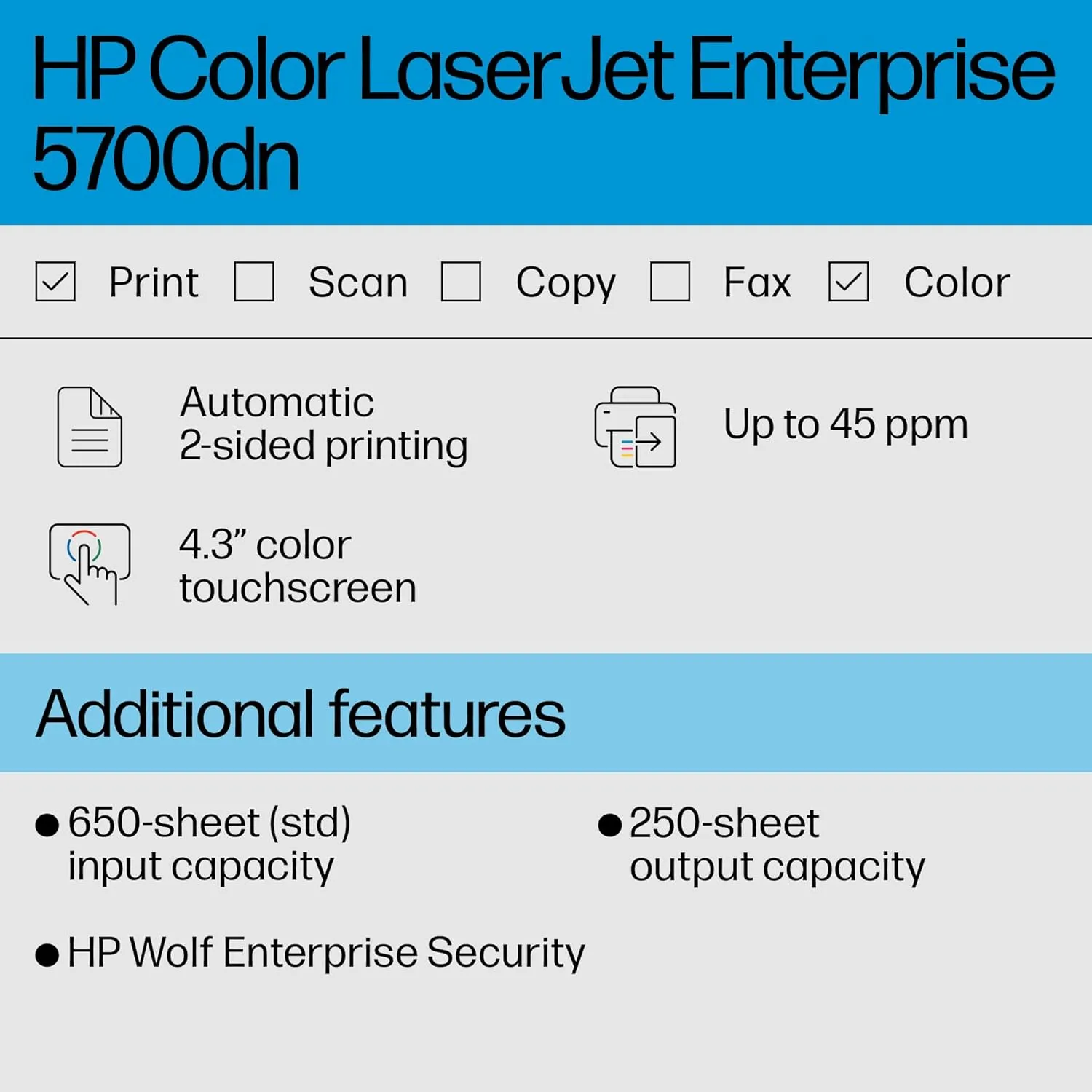 Impresora HP Color LaserJet Enterprise 5700dn (6QN28A) | Láser Profesional a Color con Doble Cara Automática, 45 ppm, Seguridad Dinámica, Pantalla Táctil y Conectividad Ethernet – Ideal para Oficinas con Alto Volumen de Impresión