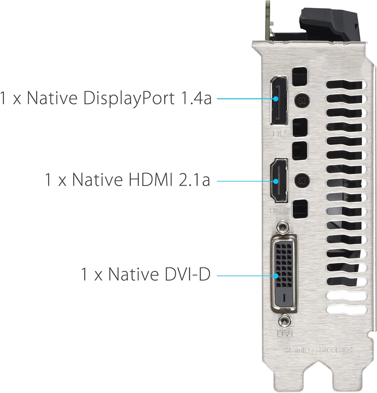 - Salidas: 1x DVI-D, 1x HDMI 2.1, 1x DisplayPort 1.4a