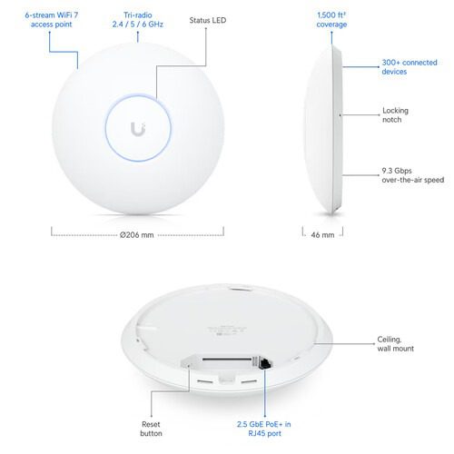 El U7-PRO cuenta con 6 streams espaciales (MIMO 2×2 en cada banda) y un puerto de enlace ascendente 2.5 GbE (Gigabit Ethernet), lo que permite aprovechar al máximo las velocidades que ofrece Wi-Fi 7. Con una cobertura de hasta 140 m² (1,500 ft²) y la capacidad de soportar más de 300 dispositivos conectados simultáneamente, es ideal para oficinas grandes, salas de conferencias, hoteles y otros entornos donde la conectividad robusta y de alta velocidad es crítica. Se alimenta mediante PoE+ (802.3at) y se gestiona de forma centralizada a través del intuitivo Controlador UniFi Network, proporcionando una solución de red inalámbrica escalable y de alto rendimiento.