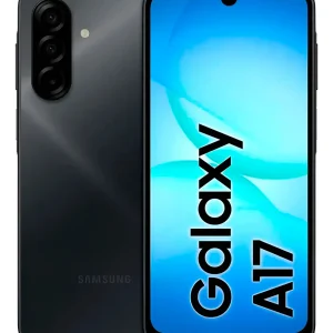 Celular Samsung Galaxy A17 5G con pantalla AMOLED de 6.6″ a 90Hz, procesador Dimensity 6100+, 6GB RAM, 128GB de almacenamiento, cámara de 50MP, batería de 5000 mAh y Android 14. Diseño elegante en color negro