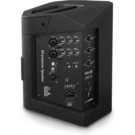 • Conectores: 2 canales de entrada XLR/Jack con interruptor de micrófono y línea + Controles de enlace XLR 3 canales de mezclador y 2 preamplificadores de micrófono, ecualizador de canal de 2 bandas, efecto de reverberación, función Bluetooth y TWS.