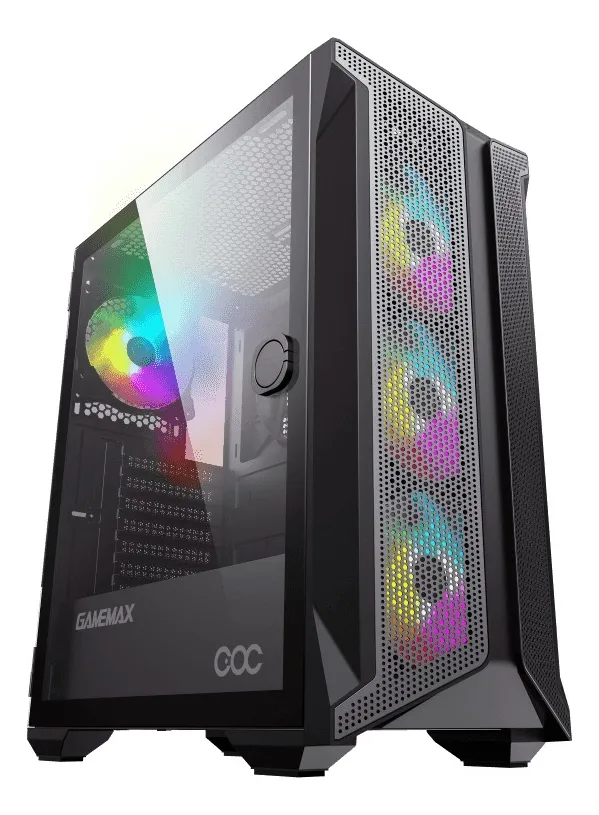 Gabinete GameMax Brufen C1 con 4 ventiladores ARGB preinstalados, panel lateral de vidrio templado, soporte para placas ATX/Micro-ATX/Mini-ITX, USB 3.0 y diseño de alto flujo de aire. Ideal para builds gaming llamativas.