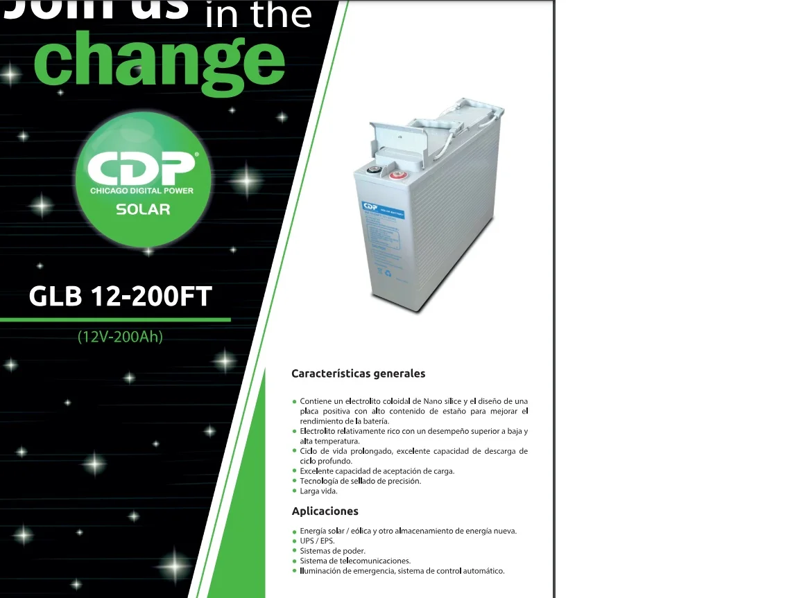 - Resistencia a descargas profundas: La batería CDP GLB 12-200FT puede soportar descargas profundas sin dañarse, lo que la hace ideal para aplicaciones de respaldo de energía.