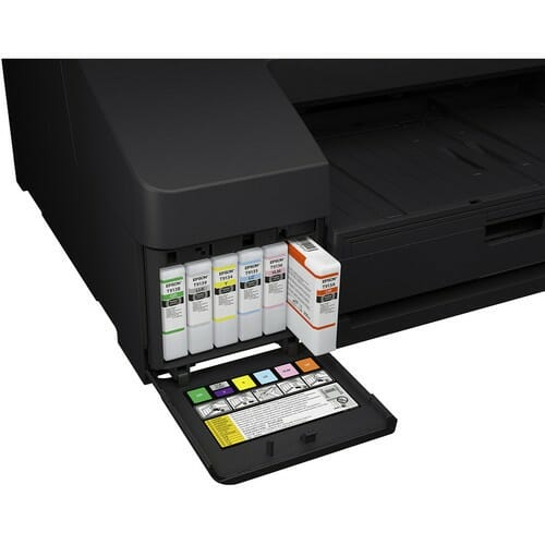 La tecnología de tinta de pigmento UltraChrome HDX de Epson utiliza 10 colores, incluidos el naranja y el verde, para producir imágenes con una amplia gama y colores precisos. Esta tinta rediseñada ofrece índices de permanencia de impresión mejorados y las tintas negras ahora son 1,5 veces más densas que la generación anterior. Esta edición comercial de la impresora también incluye una tinta violeta que amplía la gama para producir una coincidencia de color con revestimiento sólido del 99 % PANTONE PLUS GUIDE FORMULA GUIDE. Además, la tinta viene en cartuchos grandes de 200 ml.