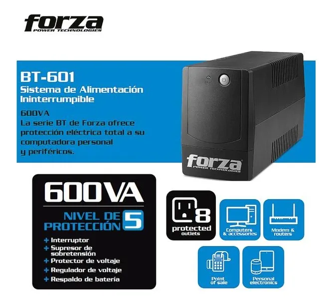 El UPS Forza BT-601 es un sistema de alimentación ininterrumpida (UPS) de tipo interactivo en línea (Line Interactive), diseñado para proporcionar energía de respaldo y protección contra problemas de energía a tus equipos electrónicos esenciales. Con una capacidad de 600VA (voltios-amperios) y 360W (vatios), este dispositivo es ideal para computadoras de escritorio, equipos de red y otros dispositivos de bajo consumo en hogares y oficinas.