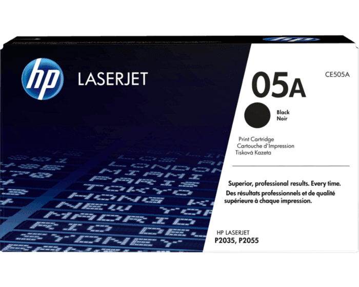 Cartucho de tóner HP 05A Original, color negro, rendimiento aproximado de 2,300 páginas.