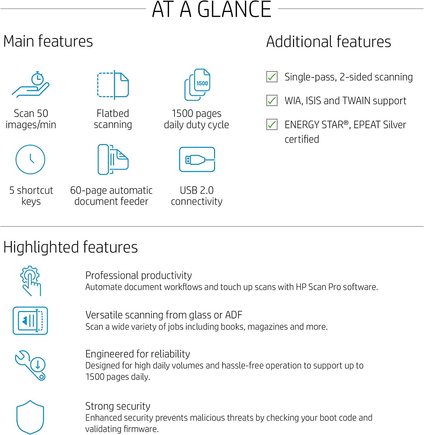 Aumente la productividad de sus tareas de escaneo profesional con el escáner compacto y confiable HP ScanJet Pro 2600 f1 , diseñado para escanear hasta 1500 páginas al día. Escanee hasta 50 imágenes (25 páginas) por minuto con un alimentador de documentos de una sola pasada, a doble cara y con capacidad para 60 páginas