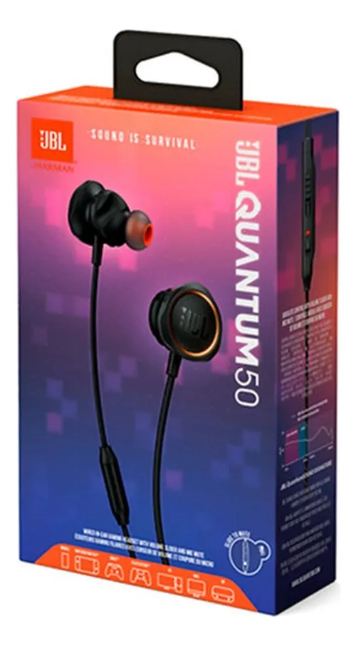 AquĂ tienes la informaciĂłn detallada sobre los AudĂfonos para Gaming JBL QUANTUM 50 (JBLQUANTUM50BLKAM), unos auriculares intraurales con cable diseĂąados para ofrecer una experiencia de audio inmersiva y una comunicaciĂłn clara en cualquier plataforma de juego.