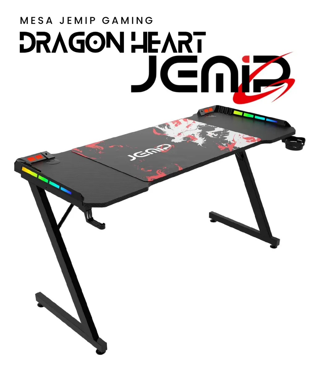 La JEMIP Dragon Heart RGB es una mesa gamer profesional diseñada para quienes buscan espacio, estilo y funcionalidad. Con dimensiones de 140 cm de largo, 60 cm de ancho y 75 cm de alto, esta mesa ofrece una superficie amplia para setups con múltiples monitores, consolas y periféricos.
