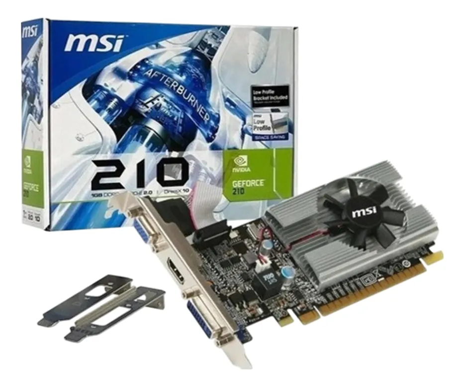 | MSI GeForce N210-MD1G/D3 | 1GB DDR3 | 64 bits | HDMI, VGA, DVI | 10.1 | Bajo perfil | Multimedia, oficina |