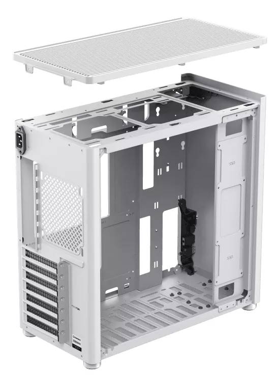 - Fuente de Poder (PSU): Compatible con fuentes de poder de formato ATX estándar, con un compartimento cubierto en la parte inferior para una gestión de cables limpia y una mejor separación térmica.