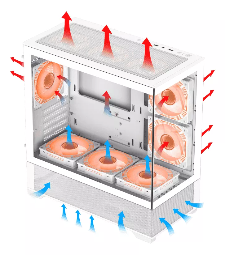 Tres ventiladores de 4.724 in alineados verticalmente en la parte delantera y un ventilador de 4.724 in en la parte trasera para atravesar el aire uniformemente por toda la cara de la caja y asegurarse de que el aire caliente en aumento siempre se agote con el flujo de aire trasero y superior.