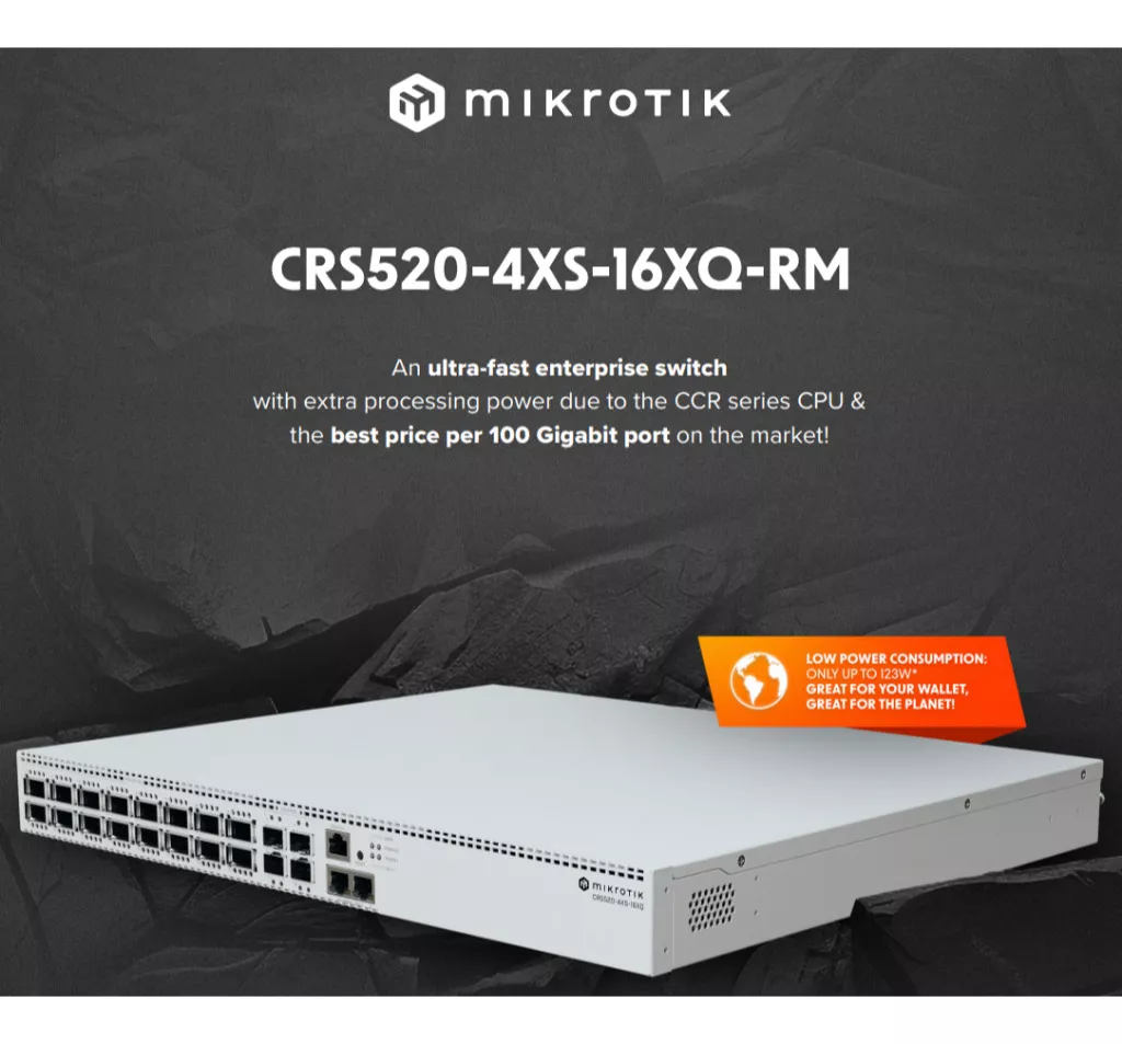 ¡Oferta! Switch en la Nube Mikrotik CRS520-4XS-16XQ-RM con 4 Puertos SFP+ 10G y 16 Puertos QSFP28 100G Rendimiento Superior y Alta Velocidad Ideal para Redes Empresariales de Gran Escala y Altas Exigencias.