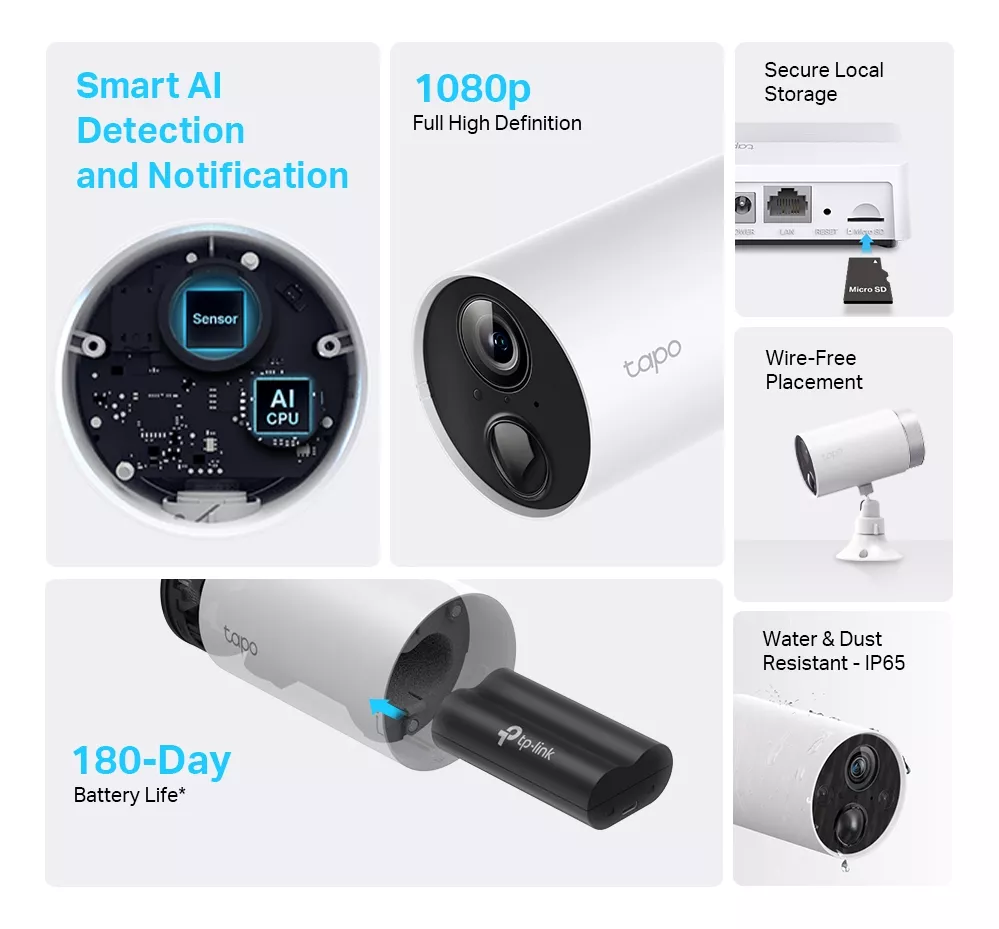 La TAPO C400S2 es una cámara de vigilancia de alta calidad diseñada para maximizar la seguridad y el rendimiento de las configuraciones de vigilancia en el hogar y la oficina. Con una resolución de video de 1080p, esta cámara proporciona imágenes nítidas y detalladas, permitiendo una vigilancia precisa y confiable. Su batería de larga duración garantiza hasta 180 días de funcionamiento con una sola carga, proporcionando una solución de seguridad sin necesidad de cables. La detección de movimiento AI y las alarmas de sonido integradas aseguran que cualquier actividad sospechosa sea detectada y disuadida de inmediato. Además, la función de sonido bidireccional permite una comunicación clara y efectiva a través del micrófono y altavoz integrados. El almacenamiento en tarjeta microSD y la opción de almacenamiento en la nube Tapo Care ofrecen una solución segura para guardar y acceder a los registros de video. Resistente al agua y al polvo con certificación IP65, la TAPO C400S2 es ideal tanto para uso interior como exterior, ofreciendo una protección integral para cualquier entorno. Ahorra tiempo y costos con la TAPO C400S2 y asegura la continuidad y calidad de tu seguridad diaria.
