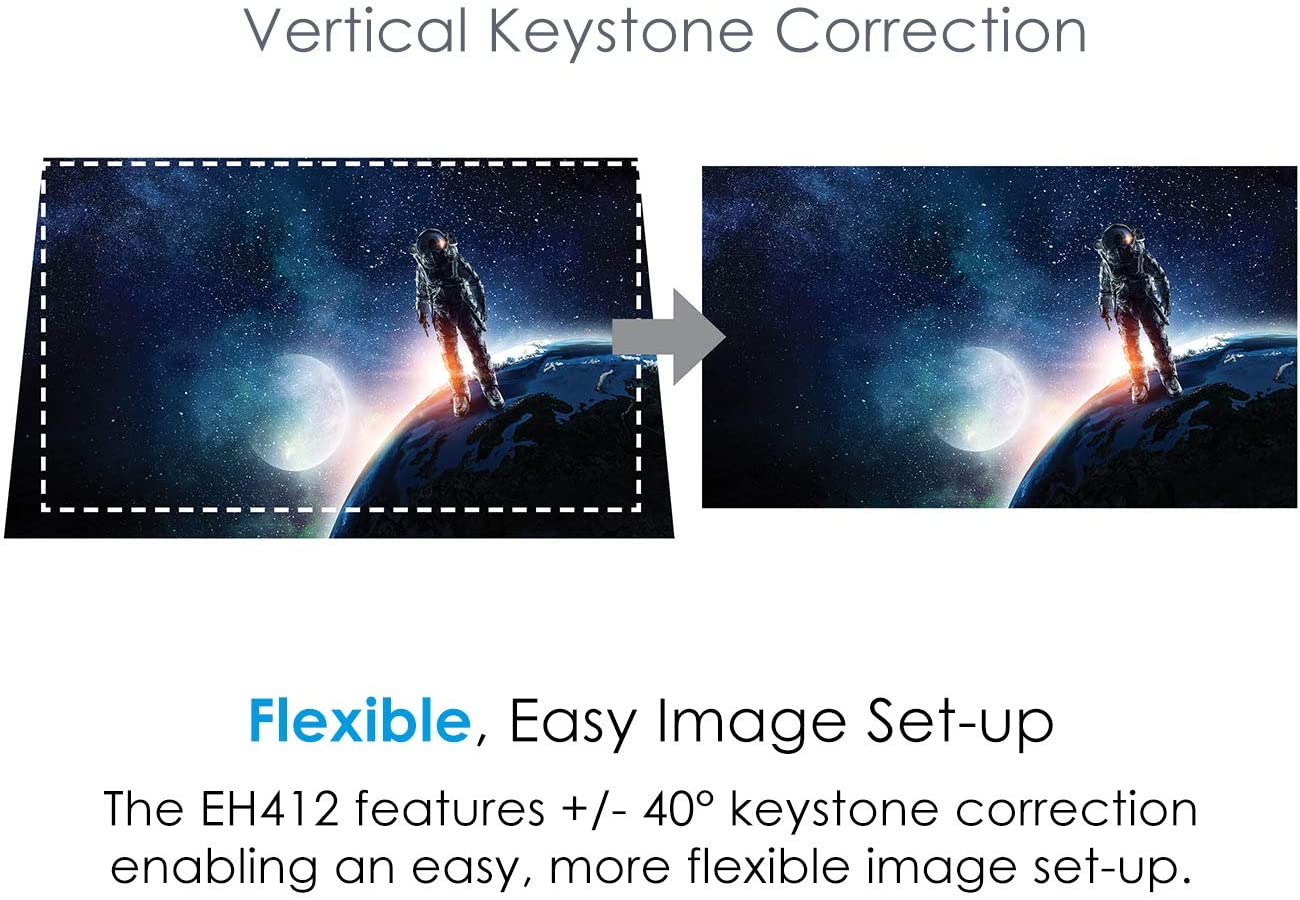 - Fácil configuración de la imagen: un 1. El zoom de 3 aumentos permite una colocación flexible en cualquier entorno, en relación de lanzamiento 1. 2-1. 47:1. La corrección vertical Keystone +/-40 grados permite que el EH412 esté descentrado sin tener que elevarlo para proyectar la imagen en la pantalla, lo que resulta en una configuración de imagen fácil y más flexible