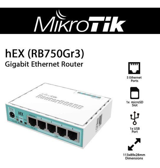 El Mikrotik hEX (RB750Gr3) es un router compacto y de alto rendimiento diseñado para redes cableadas. Es una versión mejorada de los routers de la línea hEX, que se destaca por su potente hardware y sus cinco puertos Gigabit Ethernet, lo que le permite manejar un gran volumen de tráfico de red a alta velocidad. Es ideal para redes domésticas y empresariales pequeñas que necesitan una conectividad rápida y fiable, sin necesidad de Wi-Fi.