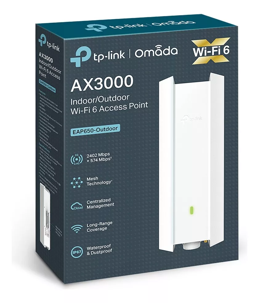 ¿Qué es el TP-Link Omada EAP650-Outdoor AX3000?El TP-Link Omada EAP650-Outdoor AX3000 es un punto de acceso (AP) Wi-Fi 6 (802.11ax) de doble banda diseñado específicamente para uso en exteriores e interiores. Ofrece velocidades combinadas ultrarrápidas de hasta 2976 Mbps (AX3000), con 2402 Mbps en la banda de 5 GHz (usando un canal de 160 MHz) y 574 Mbps en la de 2.4 GHz. Su carcasa cuenta con una clasificación IP67, lo que garantiza una resistencia excepcional a las condiciones climáticas más adversas. Es la solución ideal para extender una red Wi-Fi de alto rendimiento a áreas al aire libre, como grandes patios, piscinas, parques, o estadios, y se gestiona eficientemente a través de la plataforma TP-Link Omada SDN.