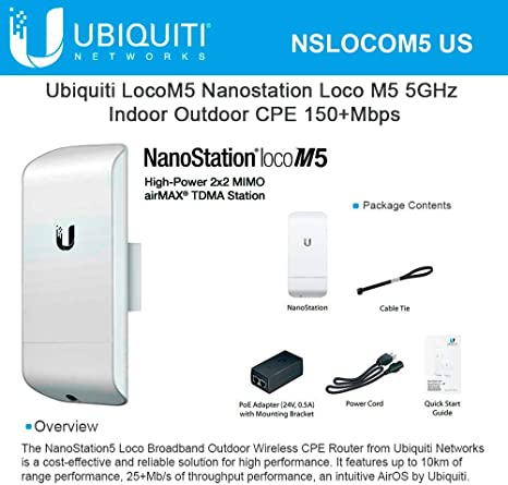 Reseña del producto: El Ubiquiti LOCOM5 NanoStation airMAX CPE LocoM5 es una solución robusta y fiable para expandir la cobertura Wi-Fi en hogares y oficinas. Con una velocidad de hasta 150 Mbps y soporte para PoE pasivo, garantiza una conexión rápida y estable. Su diseño resistente al exterior y compatibilidad con enlaces PtP y PtMP lo convierte en una opción ideal para entornos con alta demanda de conectividad.